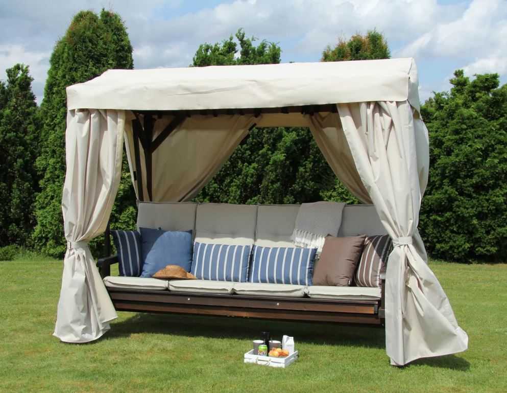 - Хорошим 4-местным вариантом станут садовые качели «Arno-WerK Элит Люкс+», превращающиеся в просторную кровать.