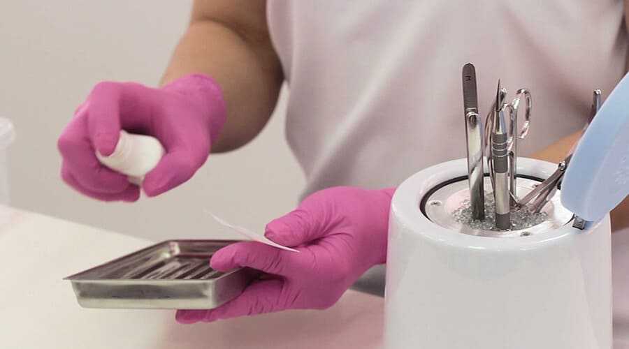 Рабочие части инструментов необходимо тщательно очистить и обработать химическими средствами, в состав которых входит антисептик. После приступать к стерилизации в ультрафиолетовом устройстве.