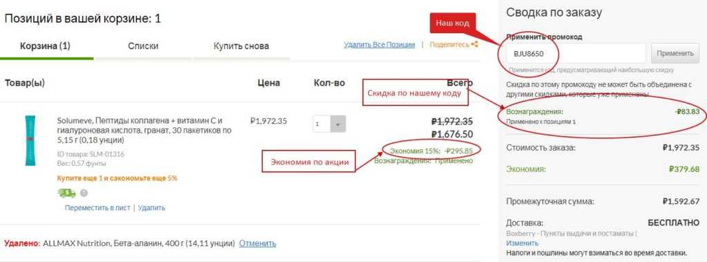 - для того, чтобы она оказалась активной, необходимо пролистать до раздела «Экономия» и в указанном поле ввести соответствующий промокод айхерб – BJU8650, или просто перейти по этой ссылке, скидка в корзине пропишется автоматически.