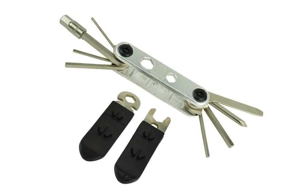 Складная карманная конструкция от известного производителя предназначена для ремонта ниппелей и камер, тормозных колодок, спиц, снятий покрышек и сборки колес. Изготовлен набор из нержавеющей стали. Кроме шестигранных ключей включает в себя гаечные обычные и для спиц, также крестовая и шлицевая отвертки. В комплектацию входит 12 предметов и бархатный чехол для удобного хранения изделия.