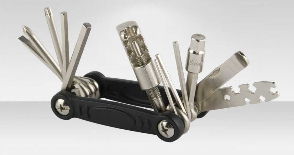 Назначение прибора – затяжка спиц и снятие покрышек. В комплектацию входят шестигранники (7 разных размеров), три накидных ключа, лопатки для бортировки в количестве 2 штук, спицевые ключи. Как и во многих других моделях, в наборе имеются два вида отверток – плоская и крестовая.