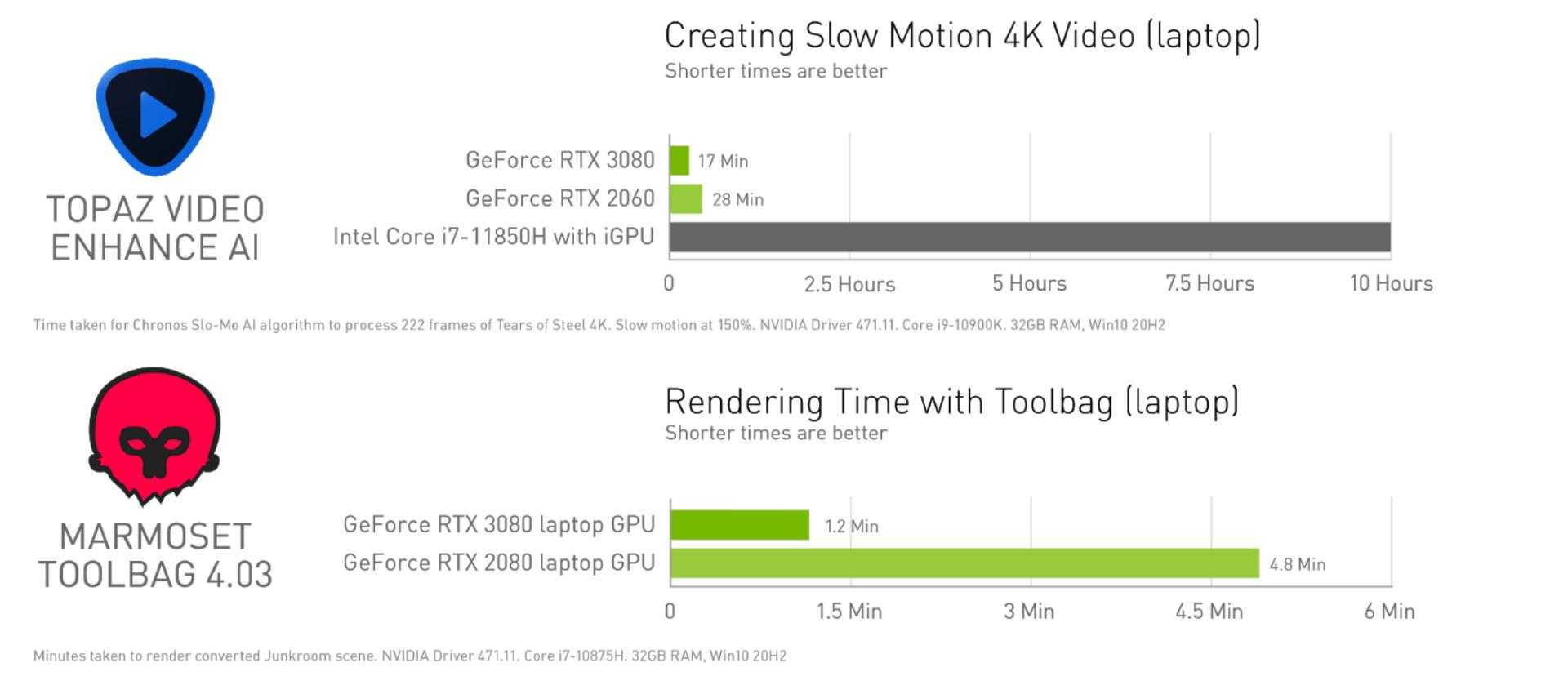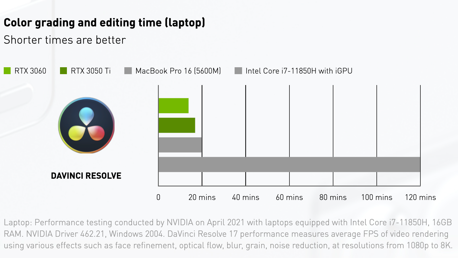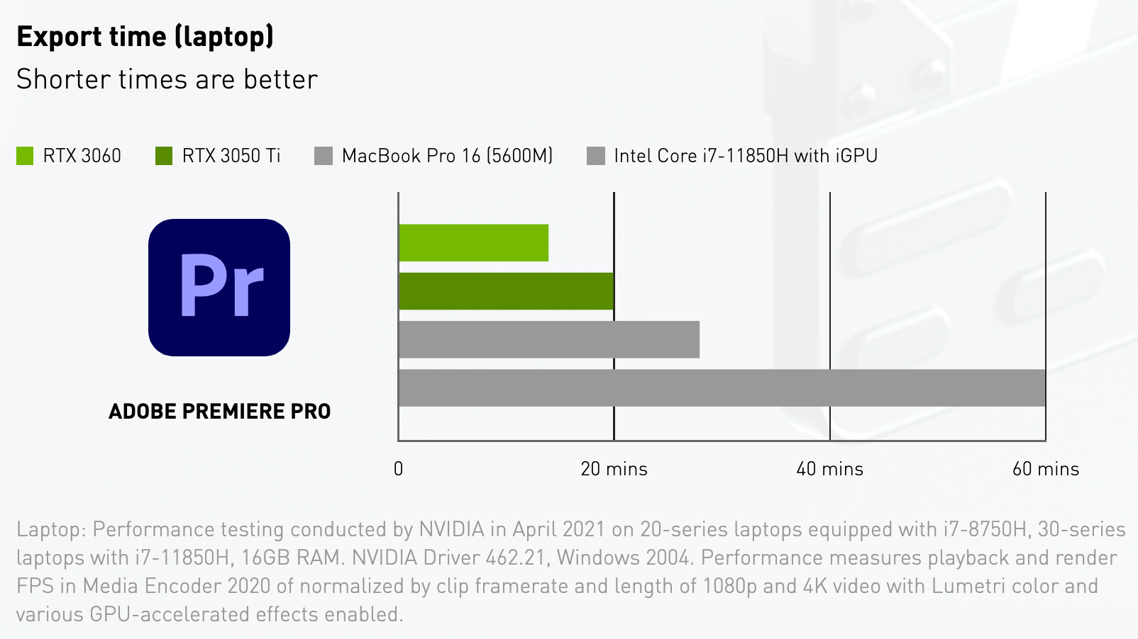 Если говорить о производительности, то, например, время экспорта видео в Adobe Premier Pro на ноутбуках даже с NVIDIA RTX 3050 Ti занимает 20 минут, когда аналогичный файл экспортируется на MacBook Pro 15 (5600M) порядка 30 минут и более часа на интегрированном в Intel Core i7-11850H графическом процессоре. А результат на RTX 3060 занимает ещё меньше времени: