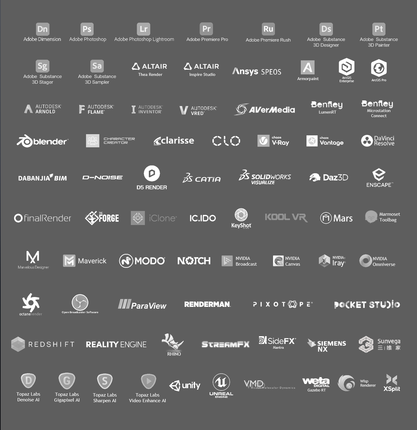 Это пакет приложений Adobe (Premier Pro, After Effects, Designer, Photoshop, Lightroom и другие), Cinema 4D, Blender, DaVinci Resolve, где можно редактировать видео вплоть до 8К, а также 3DS Max и Maya. Всего более семидесяти программ и приложений, часть из них представлена на иллюстрации: