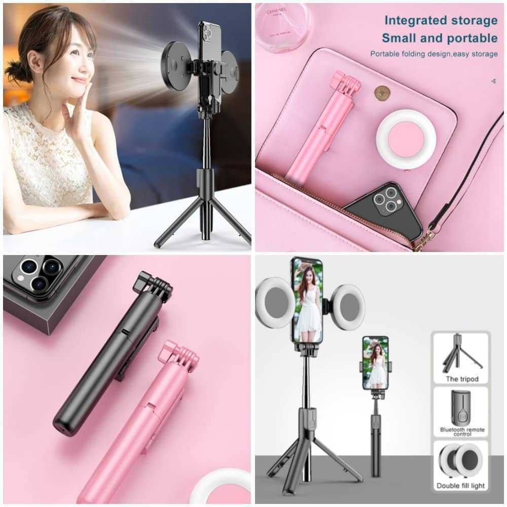 Модель используется как селфи-палка и подставка с напольным и настольным размещением. Длина изделия в сложенном виде – 20.7 см. Вес – 152 г. Головка вращается на 360 градусов. Имеется миниатюрный дистанционный пульт (тип питания – батарейка). Максимальная высота разложенной конструкции – 1 м. На конце палки встроен светильник, который работает в трёх режимах.