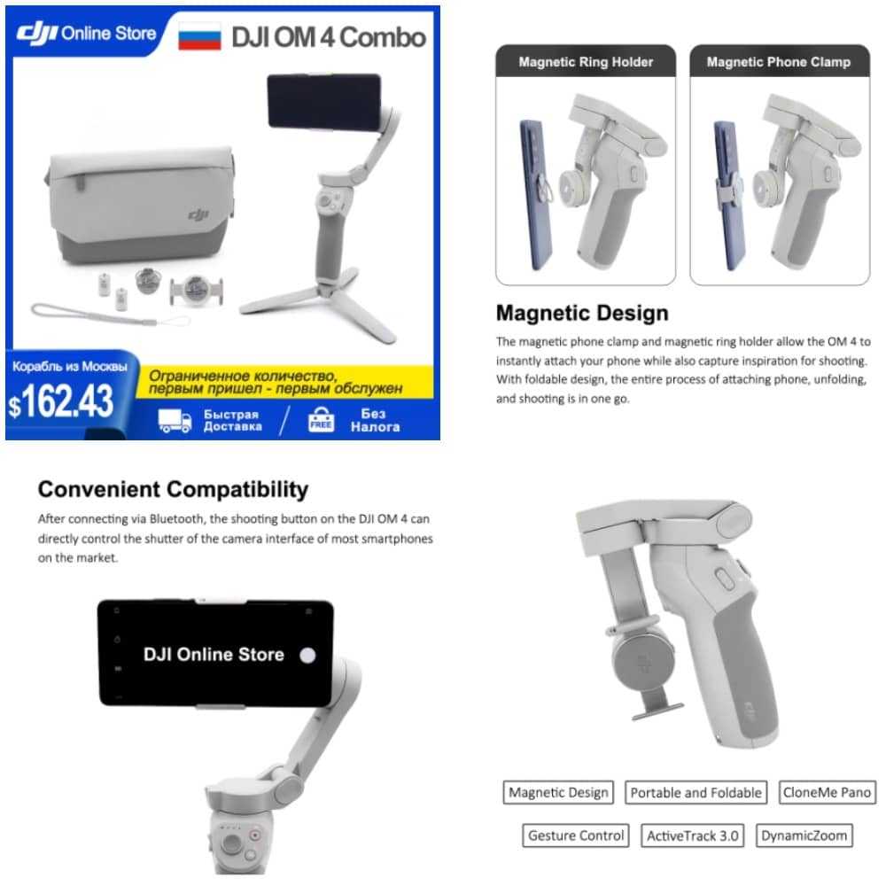 Модель оснащена магнитным зажимом для гаджета. Совместимость с телефонами следующих параметров: ширина – 6,7-8,4 см, толщина – 0,6-1,0 см, вес – до 250 г. DJI OM 4 обеспечивает высокую стабильность картинки. При съёмке дрожание полностью нейтрализуется. На ручке имеется кнопка, которая через Bluetooth позволяет пользоваться интерфейсом камеры.