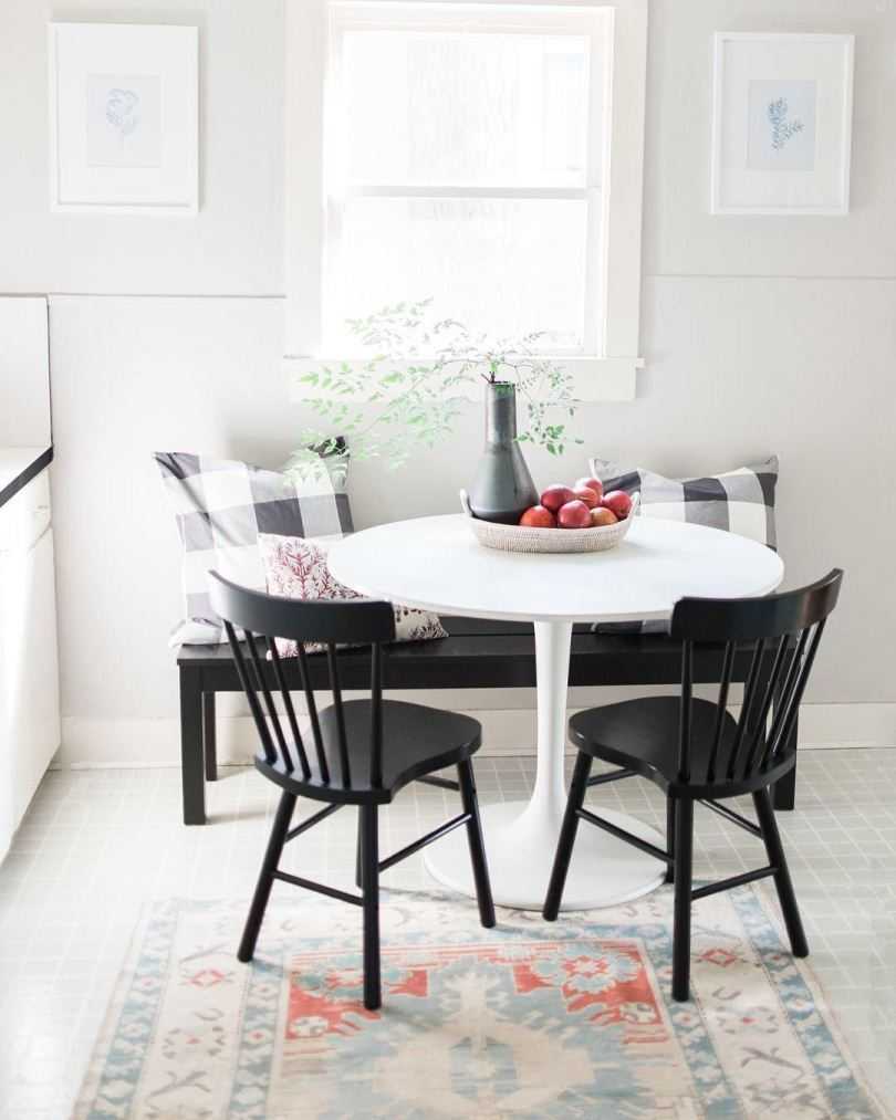 - Если есть место для углового диванчика, то в композицию впишется круглый и овальный стол. Плавные линии способны зрительно расширить пространство. Правда, если кухня очень маленькая, то этот вариант будет выглядеть громоздко.