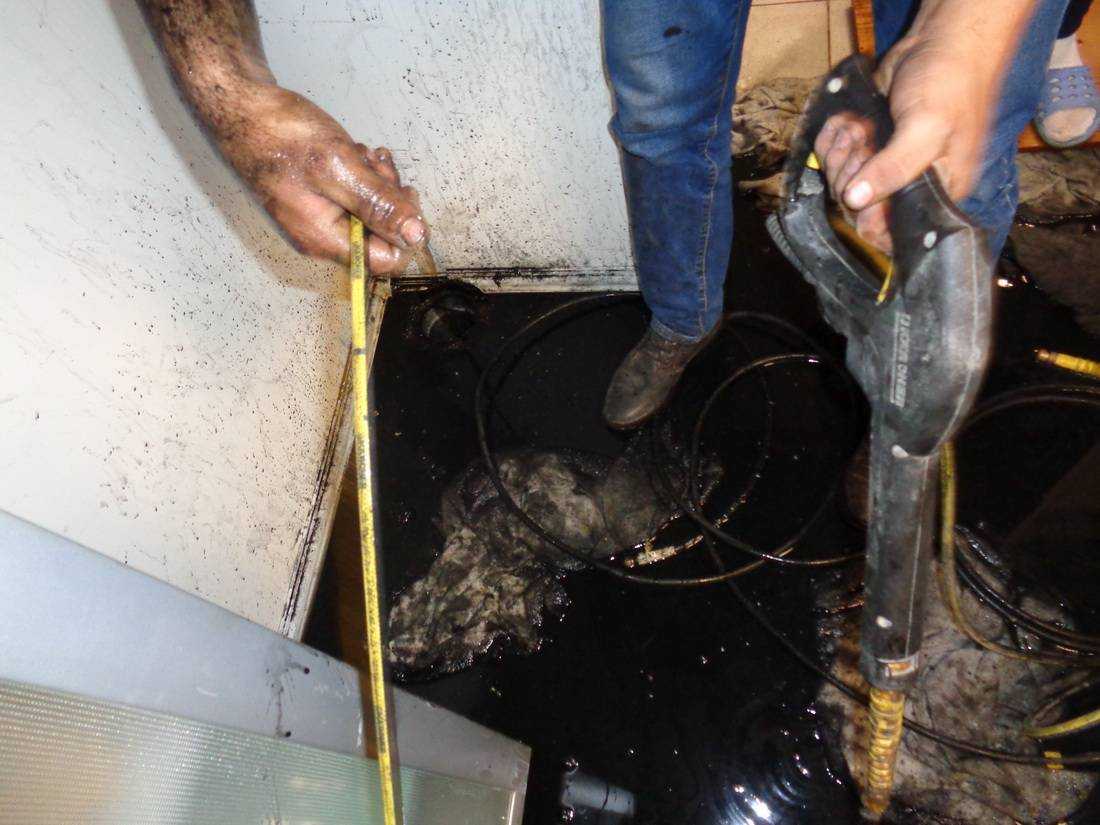 Удалить канализационную грязь. Для тщательной очистки следует воспользоваться горячей водой, металлической щёткой, а также средством, хорошо расщепляющим жир. При отсутствии спецсредства можно воспользоваться составом, предназначенным для мытья посуды.