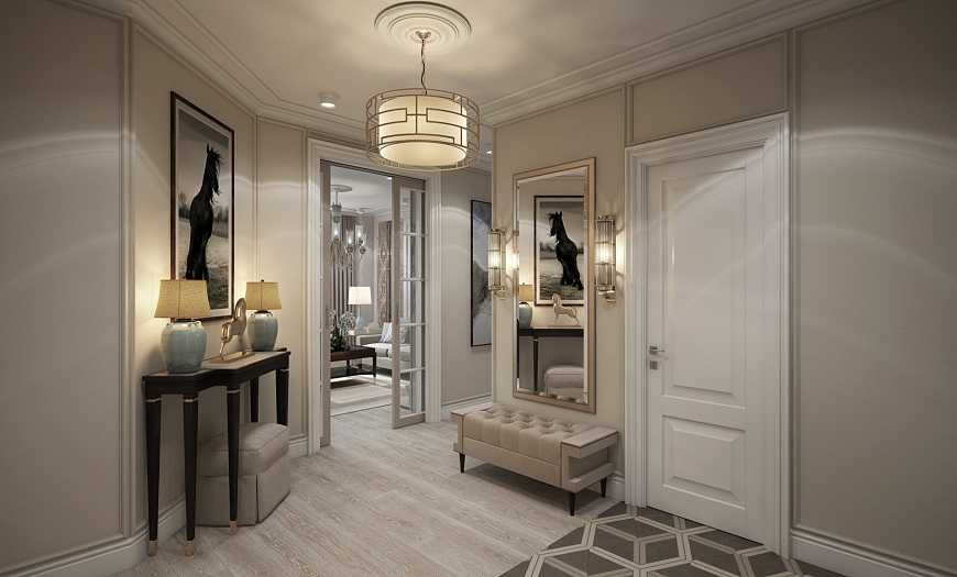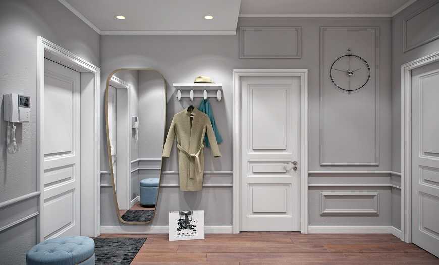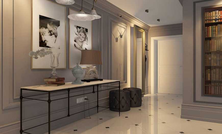 Особенно много вариантов оформления неоклассической прихожей предлагают дизайнеры. В первую очередь это обои с серебряным или золотым рельефом в виде орнамента.
