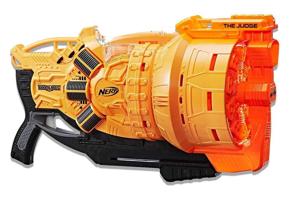 Бластер Судья, презентованный летом 2017 года, – агрессивное и грозное визуально орудие. Револьвер-дробовик имеет большие размеры: длина – 83 см, высота – 35 см. На корпусе есть вставки из прозрачного пластика, через которые просматриваются внутренние механизмы яркого игрового оружия.