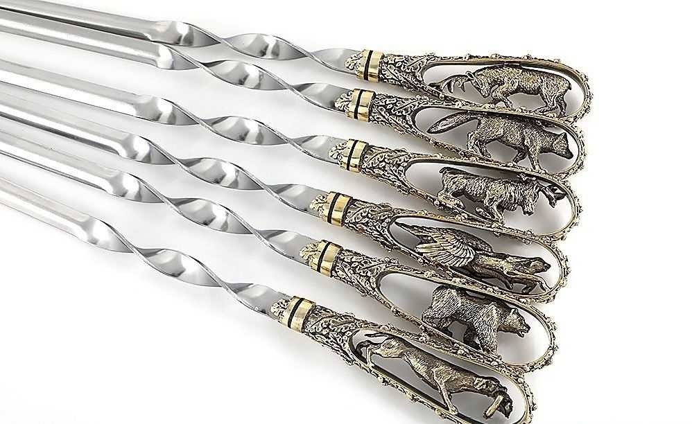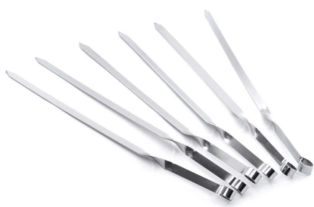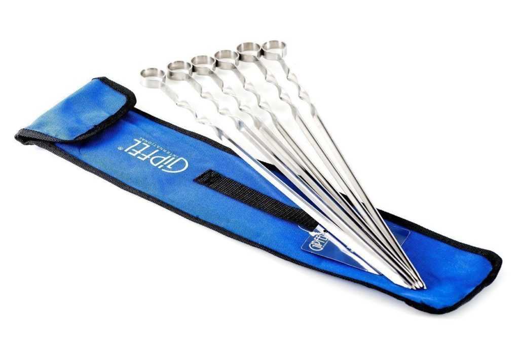 Четвертую строчку в рейтинге занимают шампуры от Gipfel. Модель представляет собой мини-шампуры, которые подойдут для небольшой компании. Длина лезвия всего 45 см. Форма самого лезвия – угловая, а толщина всего 1 мм. Несмотря на это, вертел не гнется от веса продуктов. В данном наборе всего 6 предметов, и нет какого-то особого дизайна. Рукоять — это продолжение лезвия, с переходом из спирали в кольцо. Она нагревается меньше самого шампура, однако при жарке мяса стоит быть аккуратными и не обжечься.