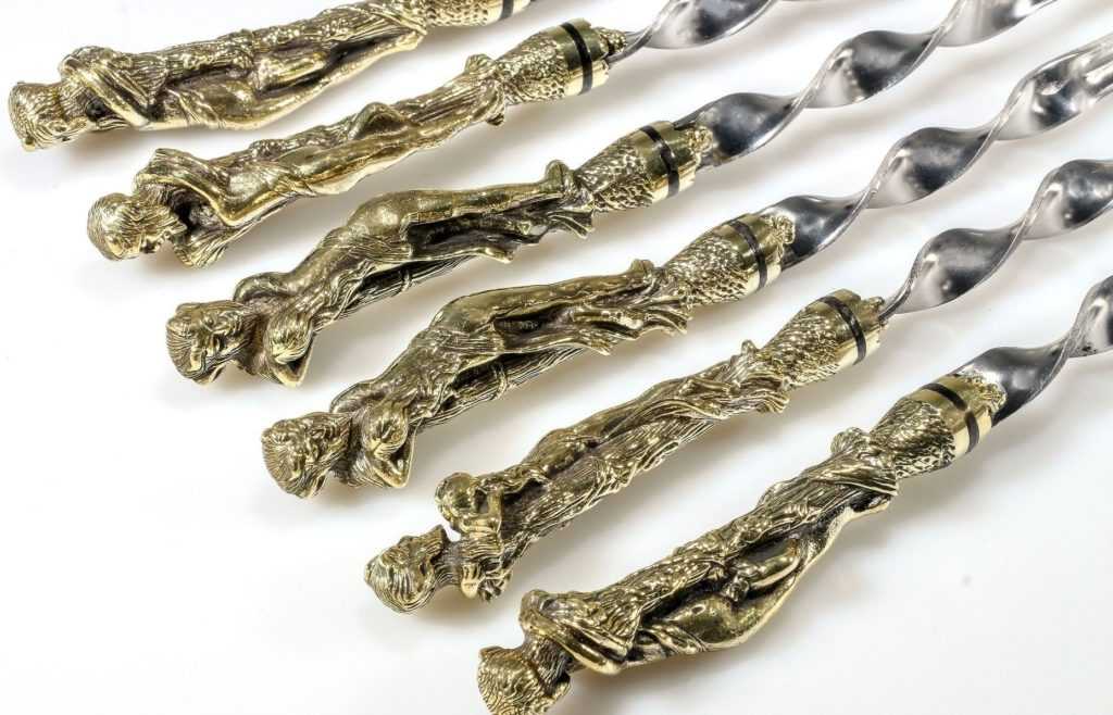 Рукоятка литая, с декоративными элементами. Объем ее в обхвате составляет 20 мм. Достаточно удобно ложится в руку. Литье в форме женских фигур и подарило название этому комплекту. Длина самой рукояти 15 см, выполнена она из специального сплава, который под воздействием высоких температур не раскаляется. Это защищает от травм, и позволяет спокойно готовить шашлык.