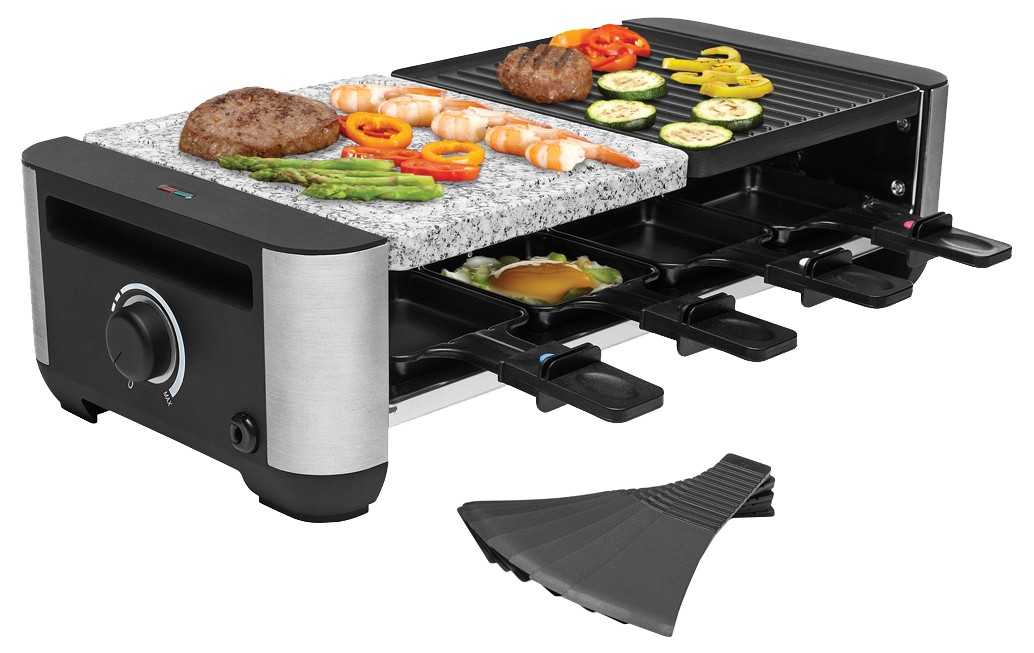- Гриль-раклетница-фондю Ariete 793 PARTY TIME. Прибор 3 в 1 с мощностью 1200 Вт. Металлический корпус, покрытие антипригарное. В комплекте восемь удобных лопаток, пользователи отмечают простоту применения. Стоимость — около 7000 рублей.