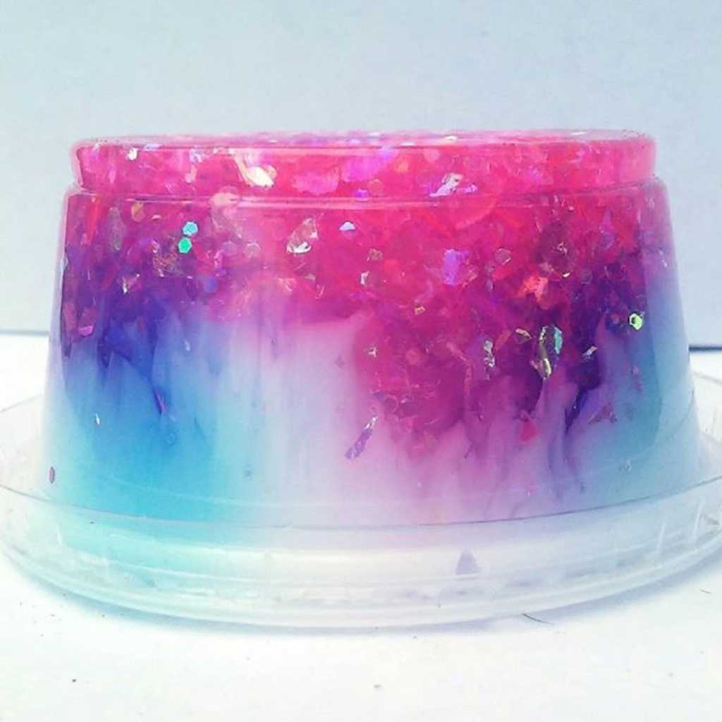 Этот вид слаймов представляет собой стеклянного лизуна, в которого дополнительно добавлены блёстки, благодаря чему игрушка переливается разными красками и светится.
