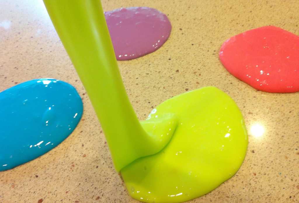 Жидкий слайм. Для приготовления лизуна-вытекашки понадобятся такие ингредиенты: тетраборат натрия, вода и клей. Небольшое количество воды нужно смешать с клеем до однородной консистенции, а затем добавить тетраборат. Если есть необходимость сделать цветной слайм, то перед как добавлять тетраборат, в воду и клей нужно добавить какой-нибудь краситель