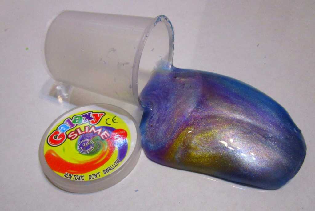 Этот лизун светится в темноте, чем напоминает млечный путь, достигается такой эффект за счёт чёрного цвета с добавлением блёстков.
