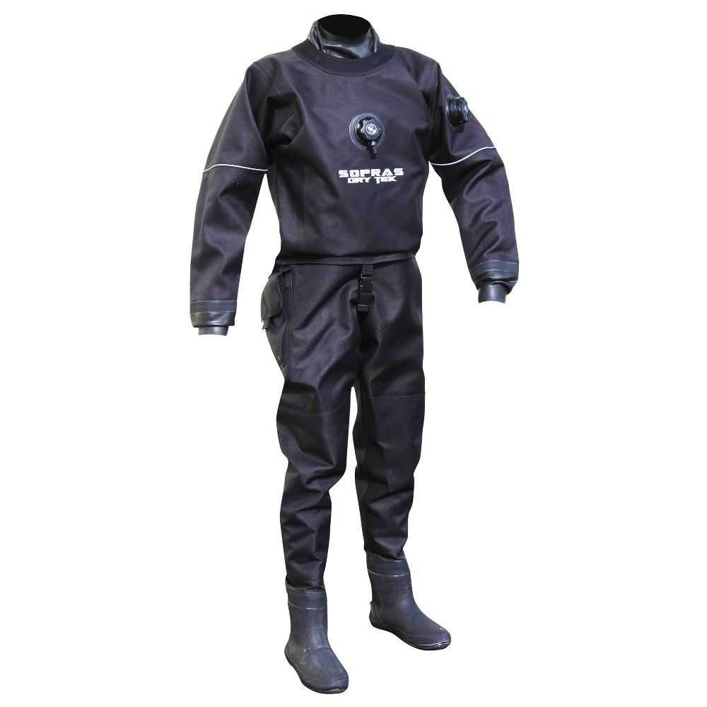 Благодаря специальным манжетам на руках и шее, а также водо- и газонепроницаемым молниям, костюм практически полностью исключает попадание воды внутрь. Это максимально герметичное снаряжение, идеально сохраняющее тепло человеческого тела. Толщина такого костюма составляет от 5 до 15 мм, он довольно тяжелый, сковывает движения, но при этом обеспечивает безопасность при погружении в воду, температура которой ниже нуля. Специальные воздушные клапаны внутри костюма облегчают движение и создают комфорт. Дополнительно сухие костюмы оснащаются ботами и шлемом. Назначение сухого гидрокостюма – длительное нахождение под водой, а также профессиональные работы, не требующие активности.