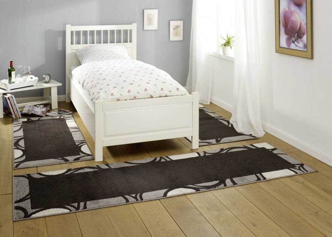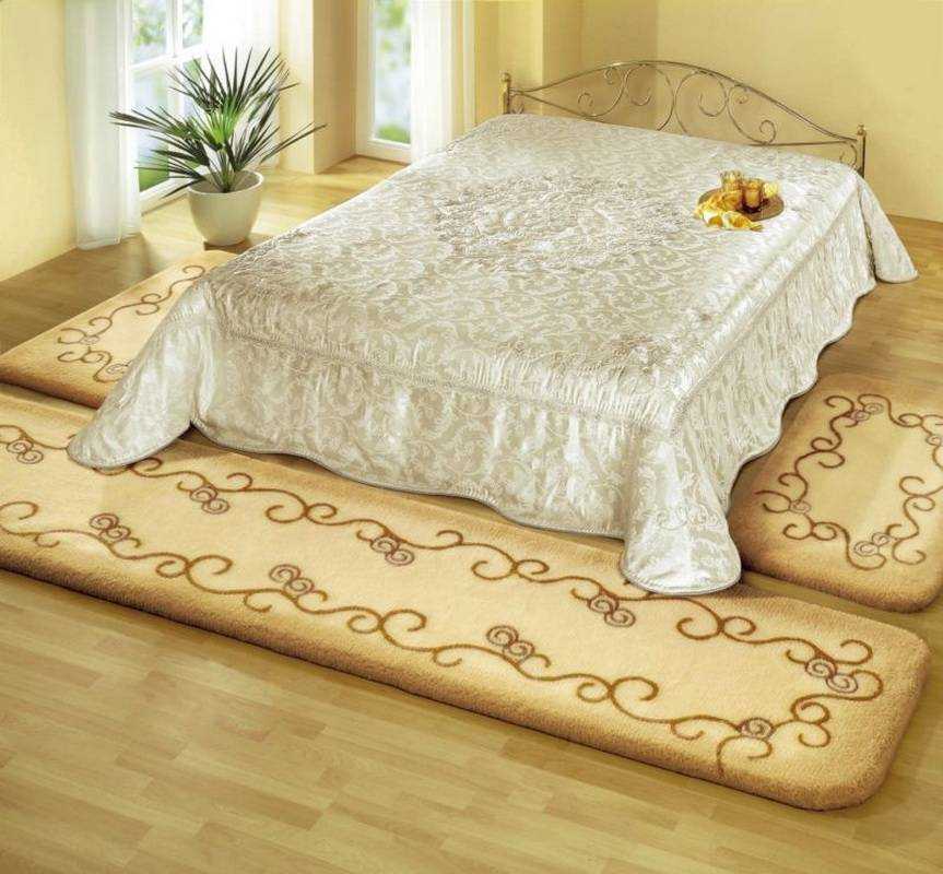 В современности прикроватный коврик располагают и немного иначе. Более длинный край кладется поперёк кровати сбоку от неё. Это довольно необычное решение, которое поможет разнообразить спальню. Также очень многие размещают коврики сразу в нескольких зонах кровати: по бокам – одинаковые, а у изножья – другую, большую по размеру модель.