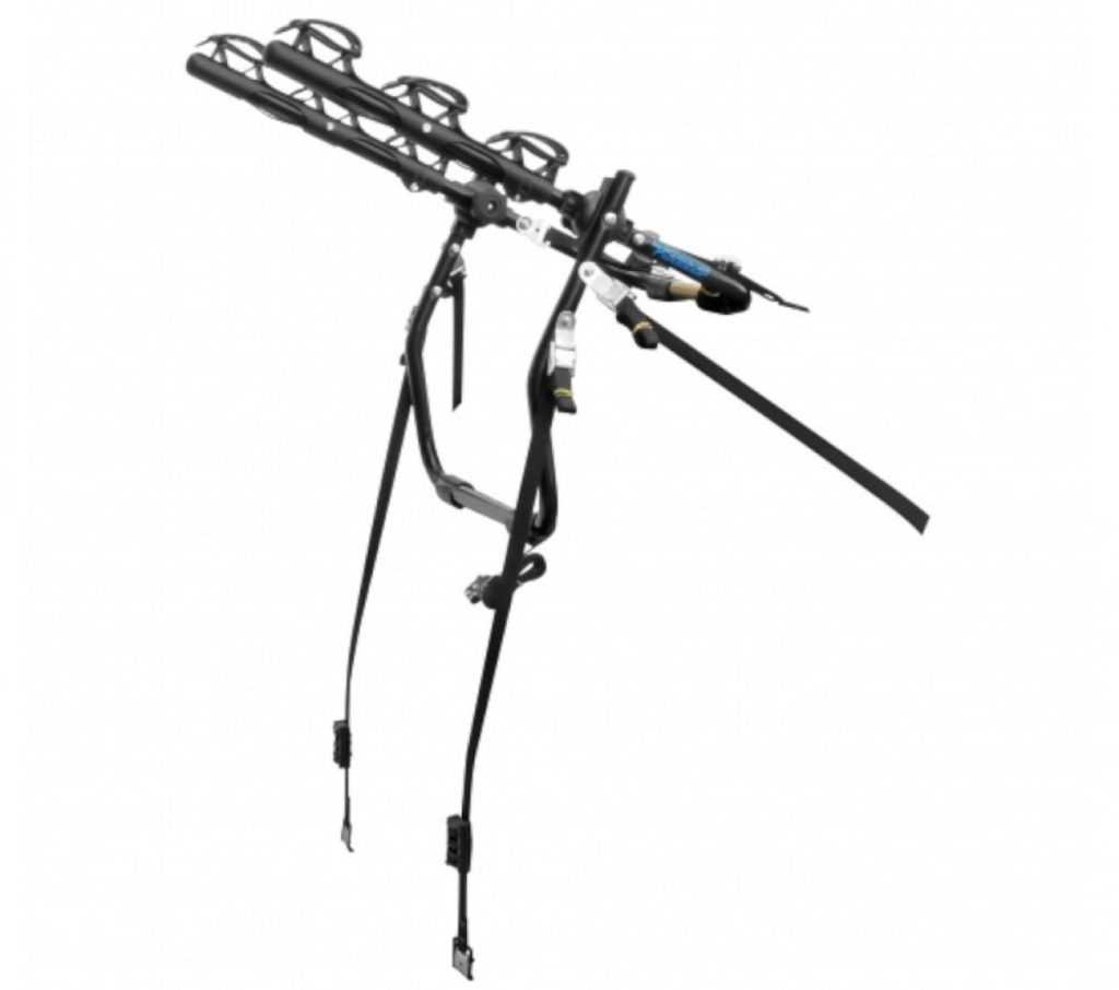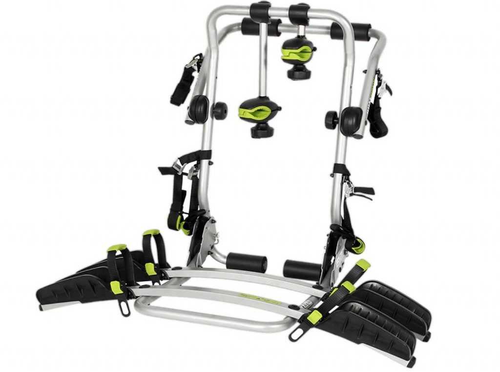 Стальной автобагажник на пятую дверь, вмещающий до 3 велосипедов. Фиксация простая, без необходимости использовать дополнительные инструменты. Нагрузка на разрыв лент крепления — до 300 кг. Максимальная нагрузка на каждый велосипед — 15 кг.