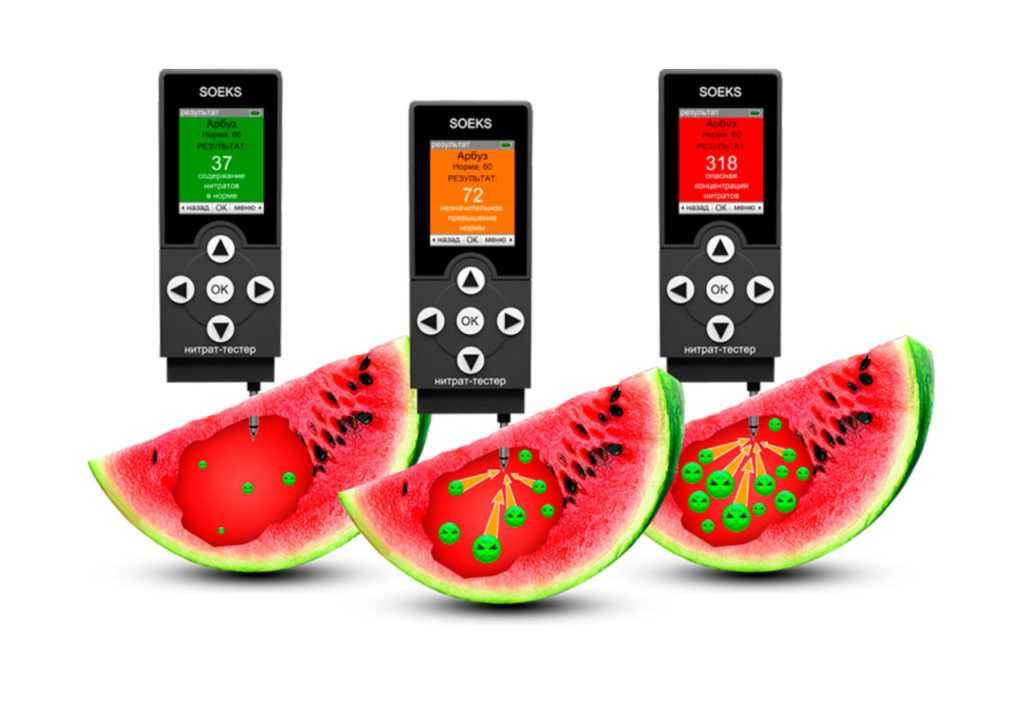 Для определения концентрации нитратов существуют особые экотестеры, которые часто сочетают в себе и другие полезные функции. Помимо измерения вредных веществ в продуктах, такие гаджеты указывают уровень жёсткости воды и экологическое состояние местности.